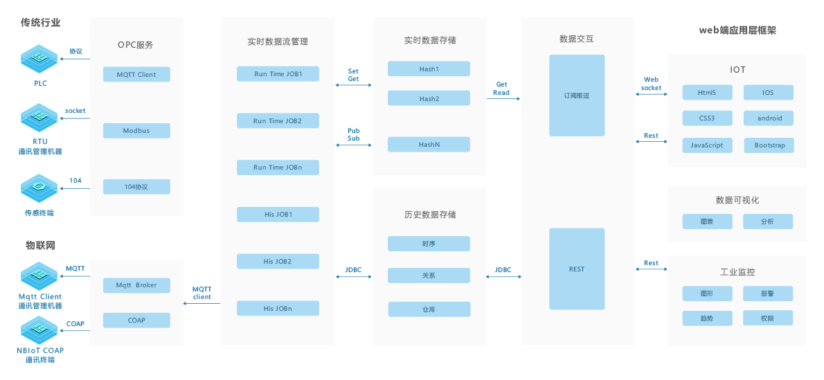 所谓taptap点点官方下载最新版智能集控运维即对taptap点点官方下载最新版进行智能化改造,将站内设备信号接至后台监控系统,实现对站内设备运行情况365*24小时监控,在设备出现问题之前及时报警,并有效消除隐患的维护方式,无人值守的智能站维护模式也是今后电力维护市场的发展趋势。taptap点点官方下载最新版智能集控运维解决方案技术架构如图 1) 传输层-物联网标准采集协议 无需架设VPN,对数据可提供加密 提供各种语言客户端(C,Java,Ruby,Python 等等),方便第三方设备接入 可支持数百万设备连接,可做到物物互联,有利于业务整合,多业务联动 由taptap点点体育工业互联网平台提供物联网服务支撑 2) 平台层-数据流处理引擎 平台采用基于taptap点点体育工业互联网平台的数据流处理引擎。该引擎在分布式(集群)的流数据处理的基础上提供数据分发、交流、以及容错的功能,把纯流式数据计算引入大数据时代。具有高吞吐、低延迟、高可靠和精确计算等特性 3) 平台层-实时数据存储 实时数据存储数据库的单节点版本已经在商品机器上超过100亿行高压测试,而插入性能没有损失。支持高达每秒百万级的写入能力,支持毫秒级精度的数据存储,不需要降精度也可以永久保存数据 4) 应用层-H5+CSS3+JS 充分利用H5前端框架更快的加载速度与展示效果,为移动应用的普及推广打下良好的基础