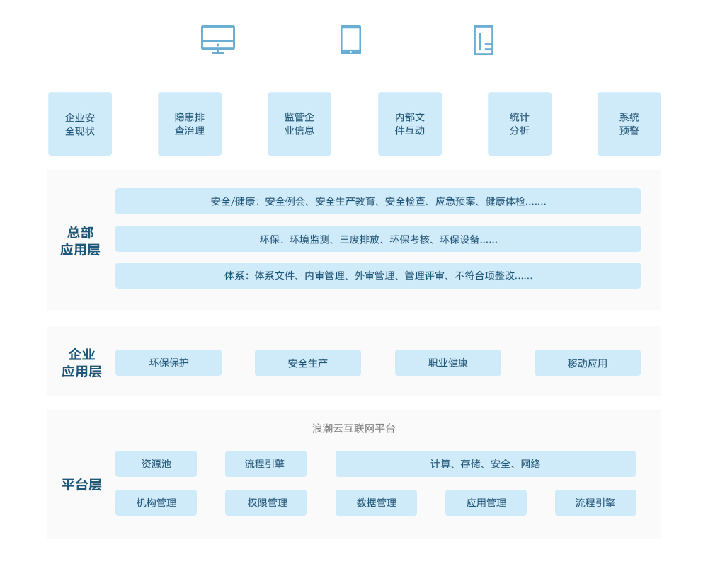 企业应用层:包括环保保护、安全生产、职业健康等相关的PC和移动端应用。