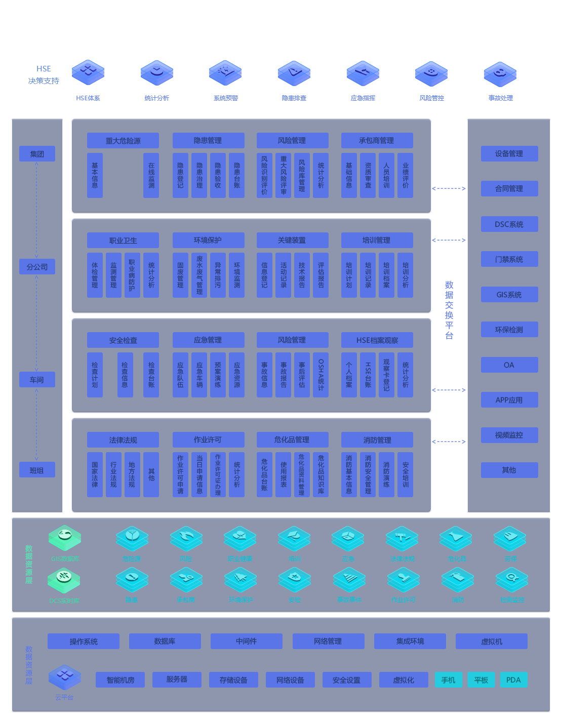 总部应用层:建立管理和健康安全环保体系,提供企业安全现状分析、隐患排查治理、企业信息监管、内部文件互动以及其他各项数据的统计分析和预警服务。