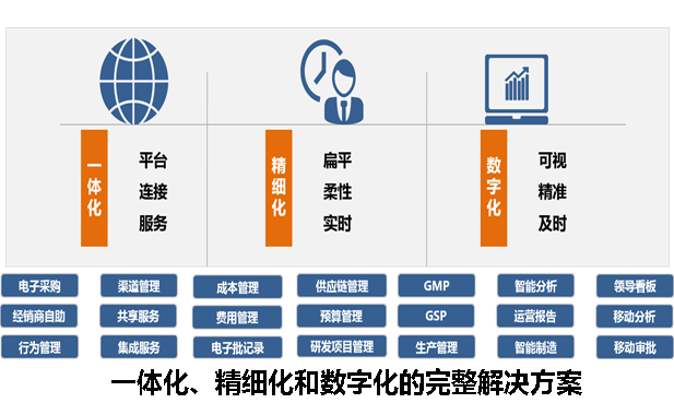 在“互联网+”、“大数据”以及“云计算”的时代背景下,不断融合新的技术和新的管理理念,紧跟企业“数字化”转型潮流,为医药企业提供一体化、精细化和数字化的完整解决方案。